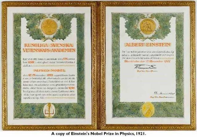 1921年,爱因斯坦获得诺贝尔物理奖时领取的证书。绿色的边框干净利落,如同他提出的狭义相对论公式一般简洁。
